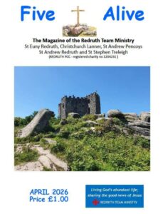 Dates, Times & News Service Sheets and Newsletters Services, News and Prayer Sheet w/b 19th April 2026 Fr Peter’s Newsletter – April 19th 2026 Services, News and Prayer Sheet w/b 12th April 2026 Fr Peter’s Newsletter – 12th April 2026 Church Events List 2026 Click on the image above to see a list of events in all of our churches throughout the year. New events are added regularly, so please check back often.To have an event added please email the Team Office at enquiries@redruthchurch.org.uk Five Alive Magazines Click on the cover above to see and download the latest edition of Five Alive Magazine, or any back issues.